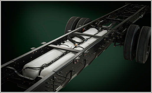 The propane autogas fuel tanks are mounted between the 50,000 psi steel frame rails for optimum protection. In addition, the tank mounting system is designed at twice the requirement specified by the National Fire Protection Association to ensure the tank remains securely attached.